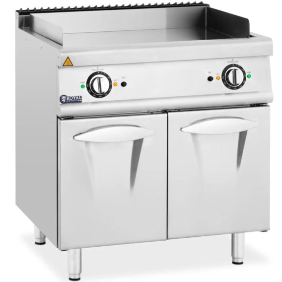 Elektryczna płyta grillowa marki Royal Catering nada się do użytku w kuchniach komercyjnych, od restauracji i barów z przekąskami po food trucki lub imprezy cateringowe. Pozwala na podawanie specjałów z grilla przez cały rok. Grill zachwyca niską emisją dymu oraz higienicznym i bardzo czystym sposobem pracy. Pod urządzeniem znajduje się pojemna szafka na garnki, patelnie i inne przybory kuchenne, które są chronione przed kurzem. Dzięki dwóm elementom grzewczym o mocy 5400 W płyta bardzo szybko osiąga temperaturę roboczą od 50 do 300deg;C, ustawianą za pomocą poręcznych pokręteł. Powierzchnia do smażenia wykonana jest ze stali chromowanej i szybko przenosi ciepło z grzałek do potrawy. Gładka płyta ma wymiary 73,5 x 55 cm. Osłona przeciwbryzgowa ochroni grillowaną żywność przed wiatrem i utratą ciepła oraz zapobiegnie spadaniu jedzenia lub pryskaniu tłuszczu dookoła. Nóżki o regulowanej wysokości zapewnią urządzeniu stabilną pozycję nawet na nierównym podłożu. Obudowa grilla wykonana została z wysokiej jakości stali nierdzewnej, jest odporna na korozję, neutralna w kontakcie z żywnością i łatwa w czyszczeniu. Posiada wyjmowaną tackę do wytopionego tłuszczu.