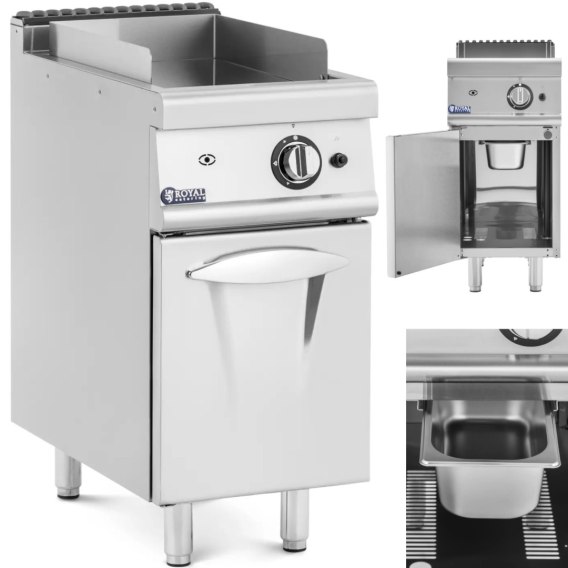 Kod producenta: 10013403 Gazowy grill marki Royal Catering to solidny model z płytą grillową z chromowanej stali. Jest idealny dla branży gastronomicznej, czy to w hotelach, kawiarniach, food truckach, bistrach, barach, restauracjach czy na wszelkiego rodzaju imprezach cateringowych. Pod gładką powierzchnią do smażenia znajduje się pojemna szafka na garnki, patelnie i inne przybory kuchenne, które będą chronione przed kurzem. Otwiera się ją za pomocą drzwi na zawiasach i szybko można sięgnąć po jej zawartość. Na dużej powierzchni grilla można szybko przygotować mnóstwo kanapek, hamburgerów, tostów francuskich, tortilli i innych przysmaków. Gazowa płyta grillowa osiąga temperaturę od 50 do 300deg;C. Poziom grzania ustawia się za pomocą pokrętła. Urządzenie włącza się za pomocą zapłonu piezoelektrycznego. Ponadto model posiada też płomień zapalający. Urządzenie jest fabrycznie ustawione na gaz typu I3B/P(50), który idealnie sprawdzi się w wielu kuchniach gastronomicznych. W zakresie dostawy znajdują się dwa komplety dysz do konwersji płyty grillowej na gaz ziemny lub LPG. Nóżki o regulowanej wysokości zapewnią stabilną pozycję nawet na nierównym podłożu. Blokada płomienia, zaokrąglone krawędzie, zintegrowany okap i osłona przeciwbryzgowa zadbają o bezpieczeństwo podczas użytkowania. Obudowa i drzwi szafki wykonane są z wysokiej jakości stali nierdzewnej. Materiał jest nie tylko wytrzymały, ale także wyjątkowo higieniczny - idealny do codziennego użytku w profesjonalnych kuchniach. Gładkie powierzchnie są odporne na większość zabrudzeń i łatwo je wyczyścić. Można też wyjąć tacę ociekową, aby dokładniej umyć ją z tłuszczu. Cechy produktu: