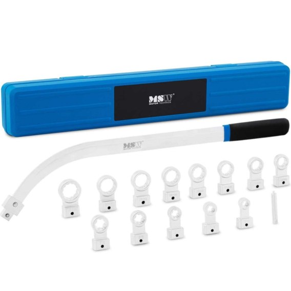 Profesjonalne klucze do napinaczy paska rozrządu marki MSW ułatwiają dostęp do nakrętek i śrub mocujących podzespoły. Model MSW-ETT-31 charakteryzuje się łatwą obsługą, co przekłada się na zwiększenie efektywności pracy. Sprzęt sprawdzi się idealnie warsztatach oraz serwisach motoryzacyjnych. Uniwersalny zestaw pasuje do większości modeli samochodów. Składa się z 13 kluczy. Dzięki zakrzywionej rękojeści manewrowanie narzędziem jest łatwe nawet w ciasnych miejscach. Cechy produktu: