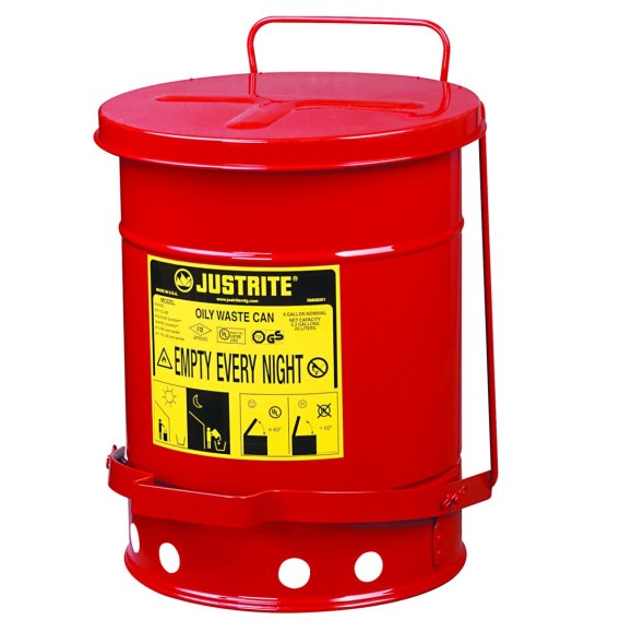 Specjalnie zaprojektowany pojemnik - kosz na odpady łatwopalne do zbiórki zaolejonych szmat, ścierek, rękawic, itp. Samozamykająca się pokrywa jest wyposażona w pedał dla łatwego użytkowania a obudowa posiada uchwyt dla łatwiejszej manipulacji. Atestowany kosz na odpady łatwopalne wykonany został z ocynkowanej stali i pomalowany trwałą farbą proszkową. Dno pojemnika zostało specjalnie podniesione w celu umożliwienia cyrkulacji powietrza pod nim, co redukuje temperaturę wewnątrz pojemnika. Pokrywa umożliwia dostęp powietrza czym ogranicza ryzyko nagromadzenia się łatwopalnych oparów i powstanie ewentualnego płomienia.
