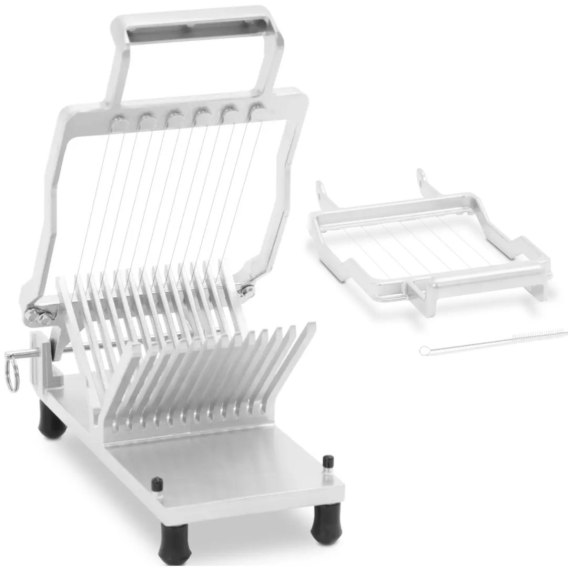 Kod producenta: 10013188 Profesjonalna krajalnica do sera marki Royal Catering charakteryzuje się wysokiej jakości konstrukcją z aluminium i stali nierdzewnej, dzięki czemu idealnie nadaje się do zastosowania w przemyśle spożywczym i gastronomii. Wyposażona jest w dwie ramki do cięcia, które kroją na słupki oraz kostki o grubości 10 lub 20 mm. Pozwala to na wszechstronne zastosowanie. Wymiana lub zmiana położenia ramek, aby otrzymać kostki, jest dziecinnie prosta. Dzięki temu obsługa jest łatwa i gwarantuje wydajność pracy w kuchni. Krajalnica strunowa do sera nadaje się do różnych gatunków średnio twardych, w tym serów miękkich i masła (niemrożonego). W zestawie poza maszynką do krojenia znajdziesz też szczotkę do czyszczenia. Cechy produktu: