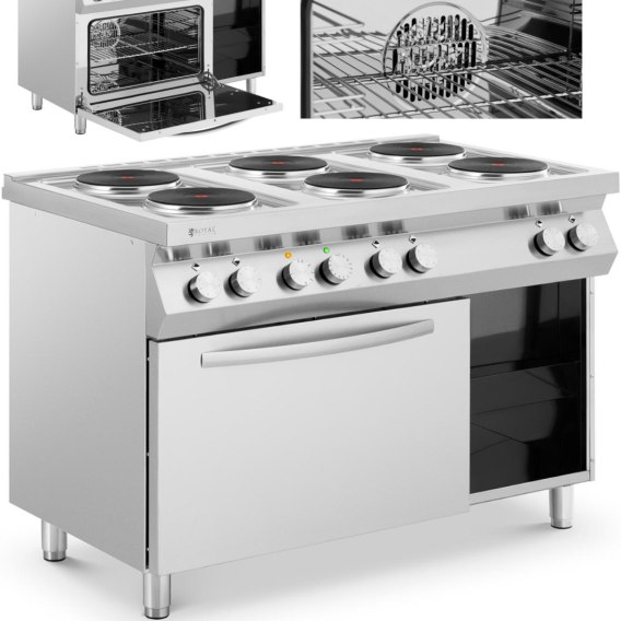 Kod producenta: 10013042 Kuchenka elektryczna marki Royal Catering sprawdzi się w profesjonalnej kuchni. Jej rozmiar wynosi 120 x 70 x 90 cm i posiada aż 6 płyt grzewczych, każda o mocy 2600 W i średnicy 22 cm. Regulacja mocy odbywa się za pomocą dużych pokręteł. Kuchenka posiada wbudowany piekarnik konwekcyjny z półkami na maksymalnie 4 blachy i mocą 3000 W. Urządzenie jest wolnostojące, jego podstawa zapewnia dużo miejsca do przechowywania przyborów kuchennych. Kuchenkę wykonano z wysokiej jakości materiałów, stal nierdzewna do obudowy i żeliwo do płyt grzewczych są łatwe w utrzymaniu czystości i wyjątkowo trwałe. Cechy produktu: