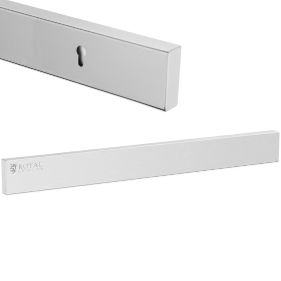 Kod producenta: 10012917 Listwa magnetyczna na noże marki Royal Catering to praktyczna pomoc kuchenna w celu utrzymania porządku. Kompaktowa listwa z silnym magnesem ferrytowym ułatwia przechowywanie ważnego sprzętu roboczego, nie tylko noży, ale także wszelkiego rodzaju widelce kuchenne, trzepaczki, klucze i inne przedmioty wykonane z metalu magnetycznego. Za sprawą długości 44,5 cm, listwa oferuje dużo miejsca. Wystarczy przymocować listwę do ściany na żądanej wysokości za pomocą śrub dołączonych do zestawu, a elegancji design wtopi się niemal w każde otoczenie. Dzięki zastosowanej stali nierdzewnej, przyrząd jest bardzo trwały i odporny na korozję. Cechy produktu: