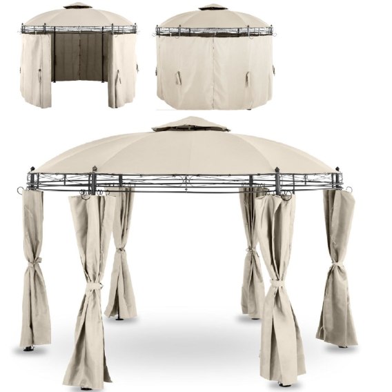 - Stylowa, okrągła altana z kremowym zadaszeniem oraz zasłonami,
