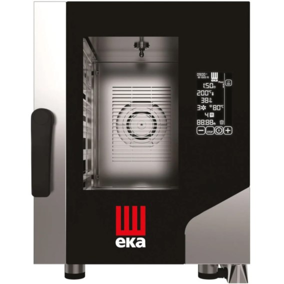 Nowoczesny piec konwekcyjno-parowy Millennial Black Mask Compact marki Tecnoeka dzięki swojej szerokości 500 mm zmieści się nawet w najmniejszej kuchni. Elektroniczny 7-calowy dotykowy panel sterowania umożliwia wygodne i precyzyjne ustawienie żądanych parametrów. Temperatura jest regulowana w zakresie 30-270˚C. Czas pracy można ustawić do 11h 59 min lub jako praca ciągła NON-STOP. Opóźnienie automatycznego włączenia pieca aż do 24 h - przydatne w celu przygotowania pieca lub dania przed przyjściem personelu do pracy. Urządzenie posiada możliwość zapisania dnia i aktualnej godziny. Para wytwarzana jest poprzez bezpośredni natrysk wody na grzałki, z 10-stopniową regulacją stopnia zaparowania. Piec wyposażono w podwójne przeszklone drzwi oraz oświetlenie LED. Blokada otwarcia drzwi przy 60˚, 90˚, 120˚ oraz 180˚ zapobiega oparzeniom obsługi poprzez niekontrolowany ruch drzwi po ich otwarciu. Zewnętrzna szyba pieca chłodzona jest grawitacyjnie. Wewnętrzna szyba drzwi jest łatwo otwierana a uszczelka drzwi wykonana została z grubego i odpornego na wysokie temperatury silikonu, montowana w obudowie pieca, łatwa do samodzielnej wymiany. Drzwi posiadają zawias po prawej stronie. Izolowana obudowa pieca wpływa na oszczędność energii elektrycznej oraz zwiększa bezpieczeństwo personelu kuchni. Rynienka pod drzwiami zapobiega kapaniu skondensowanej pary, szczególnie po gotowaniu w cyklu mieszanym i na parze. Komorę pieca wykonano z wysokiej klasy stali nierdzewnej AISI 304, posiada zaokrąglone narożniki i jest łatwa w czyszczeniu. Współczynnik szczelności to IPX 4. Regulowane nóżki zapewniają idealne wypoziomowanie pieca. Wymagane jest podłączenie do prądu, uzdatnionej wody, kanalizacji. Piece MILLENNIAL BLACK MASK posiadają dwa opatentowane rozwiązania: