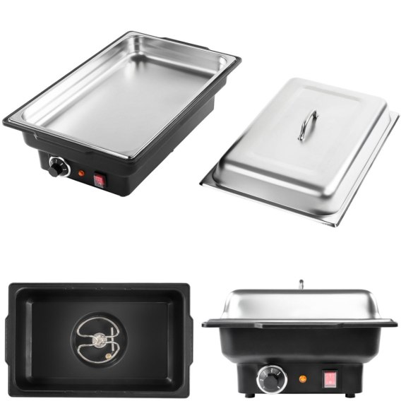 Woda, znajdująca się w pojemniku, paruje i ogrzewa (od spodu) pojemnik GN. Na ściance wanny znajduje się wskaźnik poziomu wody od 2 do 3 litrów. Panel sterowania składa się z lampki kontrolnej, włącznika/wyłącznika oraz wygodnego pokrętła do ustawiania temperatury na 5 poziomach. Oferowany podgrzewacz do potraw charakteryzuje się intuicyjną obsługą oraz ergonomiczną konstrukcją. Parametry techniczne: