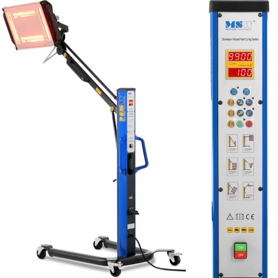 Promiennik podczerwieni marki MSW sprawdzi się w warsztatach samochodowych, lakierniach i wszędzie tam, gdzie potrzebne jest szybkie wysychanie farb, lakierów, żywic czy różnego typu wypełniaczy. Lampa posiada moc 4 x 1000 W. Urządzenie suszy farby i lakiery skuteczniej niż konwencjonalne sprzęty, ponieważ promieniowanie wnika do wnętrza i pozbawia je wilgoci od środka. Zapobiega tym samym tworzeniu się pęcherzy oraz przyspiesza proces. Promienie podczerwone nie wydzielają ciepła do otaczającego powietrza a przenoszą je bezpośrednio na powierzchnię roboczą. Hydrauliczne ramię przesuwa się w pionie i poziomie na wysokość do maks. 240 cm. Emitery można włączać i wyłączać indywidualnie. Kąt padania promieni można regulować w zależności od wymagań obrabianego przedmiotu. Obszar jednocześnie naświetlamy ma wymiary 1200 x 1000 mm. Za pomocą wyświetlacza LCD można ustawiać i monitorować czas suszenia w zakresie 0 - 99 min, można też wybrać lampy, które mają być użyte do suszenia. Temperatura zależna jest od odległości do obrabianego przedmiotu i może się wahać w zakresie 40 - 100deg;C. Metalowa kratka chroni przed uszkodzeniem oraz oparzeniem. Konstrukcja lampy wykonana została z wytrzymałej stali, koła z hamulcami zapewniają mobilność i stabilizację.