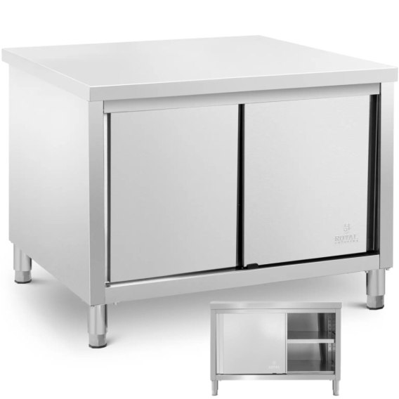 Stół roboczy z szafką Royal Catering to must-have każdej profesjonalnie wyposażonej kuchni, która spełnia wysokie wymagania branży gastronomicznej. Sprawdzi się w restauracji, stołówce, hotelu, piekarni, szpitalu czy kuchni komercyjnej. Mebel stoi na nóżkach o wysokości 15 cm, które można regulować w zakresie do 20 mm. Dzięki temu uzyskasz odpowiednią stabilność na nierównej podłodze. Powierzchnia robocza szafki ze stali nierdzewnej o wymiarach 120 x 80 cm zapewnia miejsce na codzienną pracę ze świeżą żywnością, składnikami i sprzętem kuchennym. Przemyślane połączenie blatu roboczego ze wzmocnioną płytą MDF i szafki do przechowywania zapewni szerokie zastosowanie i z łatwość w utrzymaniu porządku w kuchni. Dzięki cicho otwieranym drzwiom przesuwnym przybory kuchenne bezpiecznie i schludnie schowasz w środku. Zastosowanie przesuwnych drzwi sprawia, że szafka robocza idealnie nada się do mniejszych kuchni. Wnętrze przedzielone jest solidną półką, która zapewni porządek wewnątrz. Całkowite obciążenie stołu gastronomicznego wynosi 500 kg. Z czego 300 kg przypada na wzmocniony blat, podczas gdy dolne półki zniosą obciążenie po 100 kg. Wykonany z wysokiej jakości stali nierdzewnej stół roboczy z szafką zachwyca dużą wytrzymałością, gwarantuje długą żywotność oraz jest odporna na korozję i uszkodzenia mechaniczne (np. zadrapania). Łatwy w pielęgnacji materiał bez problemu wyczyścisz. Dzięki temu mebel spełni wymogi higienicznej pracy z żywnością. Cechy produktu:
