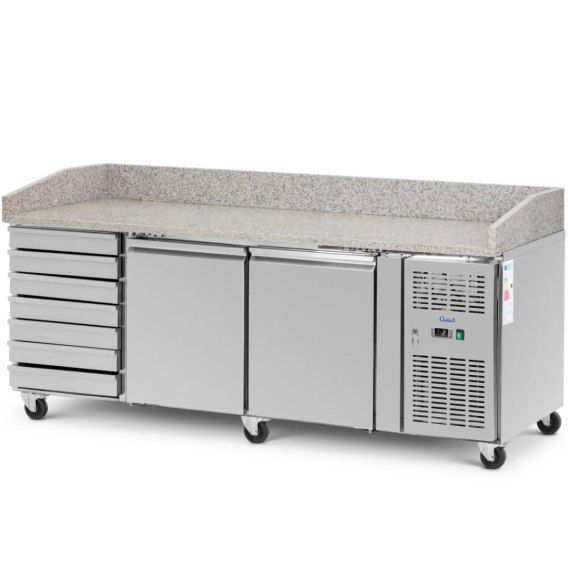 - Gastronomiczny stół chłodniczy o dużej pojemności 390 l, z 2 komorami, 7 szufladami i granitowym blatem 202 x 80 cm,