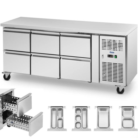 - Stół chłodniczy o pojemności 410 l, sześciu szufladach i z wzmocnionym blatem o wymiarach 179,5 x 70 cm,