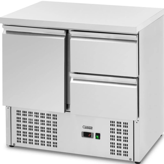 Kod producenta: 10013231 Stół marki Royal Catering zapewnia świeże składniki do szybkiego przyrządzenia różnorodnych potraw. Sprawdzi się w restauracjach, kawiarniach, barach szybkiej obsługi i hotelach. Będzie też nieocenioną pomocą w pizzeriach, barach sałatkowych oraz punktach z kebabami i falafelami. Blat roboczy ma wymiary 90 x 70 cm. Zakres chłodzenia wynosi od 2 do 10deg;C. Temperatura ustawiana jest za pomocą łatwego w obsłudze cyfrowego panelu sterowania. Automatyczny termostat dba o utrzymanie wybranego poziomu. Urządzenie szybko osiąga żądaną temperaturę za sprawą kompresora o mocy 235 W. Stół posiada również funkcję automatycznego odmrażania, która zmniejsza koszty energii elektrycznej i skraca czas pracy. Pojemność urządzenia wynosi 230 litrów. Stół chłodniczy o długości 90 cm pomieści pojemnik GN 1/2 w dwóch szufladach. Przestronna komora oferuje dodatkową przestrzeń do przechowywania. Obudowę stołu wykonano z wysokiej jakości stali nierdzewnej, która jest biologicznie obojętna, nie reaguje w kontakcie z żywnością, a co za tym idzie, nie szkodzi zdrowiu. Jest także wytrzymała i odporna na korozję oraz łatwa w czyszczeniu. Nóżki są regulowane, co pozwala dostosować stół do podłoża. Cechy produktu: