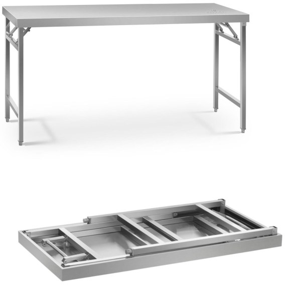 Stół posiada system składania sprężynowego - w szybki i łatwy sposób można go złożyć i transportować. Został wykonany ze stali nierdzewnej co jest gwarancją trwałości i stabilności w trakcie pracy. Jest odporny na korozję, uporczywe zabrudzenia i uszkodzenia mechaniczne. Nie wchodzi w reakcje z żywnością, jest bezpieczny dla zdrowia. Blat o wymiarach 180x60 cm zapewnia dużo miejsca. Dzięki regulowanym nóżkom wysokość stołu można zmienić w zakresie +/- 10mm. Udźwig stołu wynosi 230 kg. Cechy produktu: