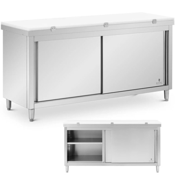 Kod producenta: 10013210 Szafka robocza marki Royal Catering sprawdzi się w każdej profesjonalnie wyposażonej kuchni, która spełnia wysokie wymagania branży gastronomicznej. Powierzchnia robocza szafki ma wymiary 180 x 60 cm i zapewnia miejsce na codzienną pracę ze świeżą żywnością, składnikami i sprzętem kuchennym. Pomysłowe połączenie deski do krojenia MDF o grubości 30 mm z wytrzymałą uszczelką z tworzywa sztucznego i szafką do przechowywania pozwala na szerokie zastosowanie i utrzymanie porządku w kuchni. Wyposażona w dwoje praktycznych i zajmujących mało miejsca drzwi przesuwnych, szafka robocza szczególnie polecana jest do małych kuchni. Naczynia przechowywane wewnątrz pozostają bezpieczne i czyste. Wnętrze przedzielone jest solidną półką, która zapewnia porządek wewnątrz szafki. Nośność półki wynosi 70 kg a całkowite obciążenie szafki 500 kg. Mebel zachwyca dużą wytrzymałością, gwarantuje długą żywotność oraz jest odporny na korozję i uszkodzenia mechaniczne (np. zadrapania). Materiał jest łatwy w czyszczeniu, doskonale spełnia wymagania higienicznej pracy z żywnością. Cechy produktu: