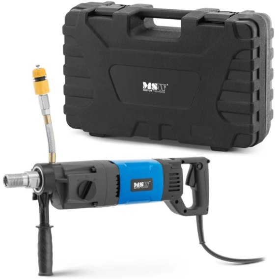 Wiertnica do betonu marki MSW pozwoli na wywiercenie otworów w twardych materiałach, takich jak beton, mur lub asfalt. Jeśli podczas wiercenia używa się statywu wiertniczego (brak w zestawie), można zrobić duże otwory o średnicy do 165 mm. Wiertnica ma moc 1900 W i maksymalną prędkość 2170 obr./min. Są to idealne wartości do ręcznego wiercenia rdzeniowego otworów do średnicy 100 mm. Aby uzyskać najlepsze wyniki, należy użyć dwóch poziomów mocy, a także wykorzystać wiertła o największej średnicy przy najniższej prędkości. Urządzenie posiada funkjce chłodzenia wodą podczas wiercenia. Złącze jest zintegrowane bezpośrednio z urządzeniem. Zmniejsza to zużycie wiertła, ogranicza konserwację maszyny i zapewnia dłuższą żywotność. Aby wymienić szczotki węglowe, wystarczy zdjąć osłonę ochronną. Diamentowe wiertła rdzeniowe o różnych średnicach bezpiecznie mocuje się w urządzeniu za pomocą uchwytu. Wiertłem diamentowym można wiercić w betonie zbrojonym, cemencie, murze, asfalcie i kamieniu naturalnym. Przewód zasilający o długości 3,5 m zapewnia maksymalną swobodę ruchów. Dzięki wbudowanemu wyłącznikowi różnicowoprądowemu (PRCD - Portable Residual Current Device) można zawsze bezpiecznie korzystać z urządzenia. W przypadku zwarcia następuje natychmiastowe zatrzymanie pracy.