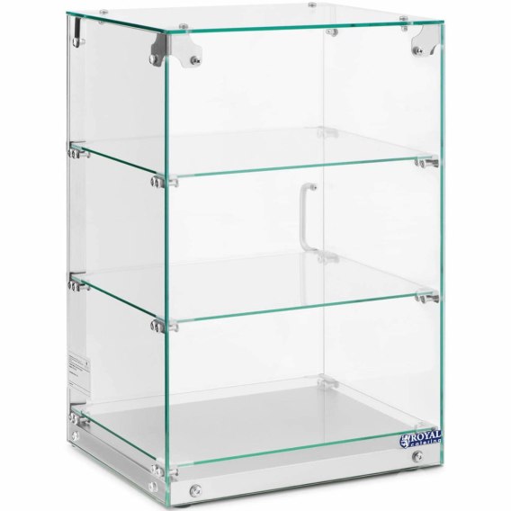 Kod producenta: 10012872 Witryna marki Royal Catering sprawdzi się do prezentacji ciast, deserów czy innych przysmaków w piekarniach, kawiarniach, cukierniach. Pojemność witryny wynosi 60 l. 3 poziomy posiadają wymiary 39 x 30 cm. Każda półka pomieści do 12,5 kg ciast, pieczywa czy deserów. Gablota wykonana została ze szkła hartowanego i stali nierdzewnej. Ma elegancki wygląd i jest łatwa w czyszczeniu. Antypoślizgowe nóżki zapewniają jej stabilność i chronią powierzchnię blatu przed zarysowaniem. Cechy produktu: