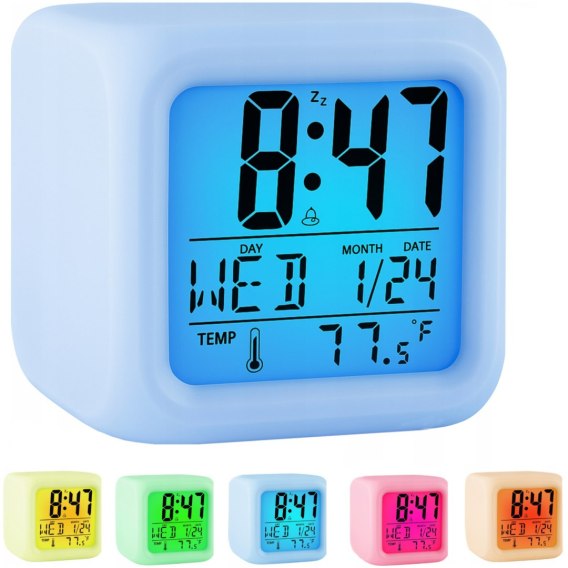 Kod producenta: 1029722 Kompaktowy budzik z funkcją zegara, termometru i datownika sprawdzi się idealnie do sypialni, pokoju dziecka czy na biurko. Dzięki podświetleniu LED w 7 zmieniających się kolorach pełni również funkcję nastrojowej lampki nocnej. Wyposażony w wyraźny wyświetlacz LCD z dużymi cyframi, prezentuje godzinę w formacie 12/24 h oraz temperaturę w deg;C lub deg;F. Bezprzewodowy i zasilany bateryjnie, doskonale sprawdzi się w domu, jak i w podróży np. na campingu lub pod namiotem. Cechy produktu: