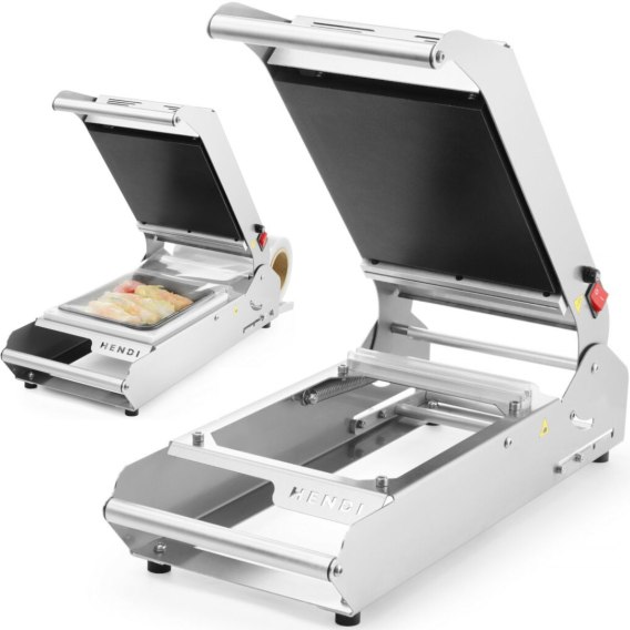 Zgrzewarka do tacek firmy Hendi służący do szczelnego pakowania świeżych produktów spożywczych. Przeznaczona jest do użytku dla firm cateringowych, restauracji i supermarketów. Solidna i stabilna konstrukcja ze stali nierdzewnej. Pokrywa z mechanizmem sprężynowym dla łatwego i bezpiecznego otwierania. Proces zgrzewania ułatwia zastosowanie łożysk i specjalnego tworzywa ślizgowego. Amortyzator docisku zapewnia szczelność pakowania i zapobiega zgniataniu opakowań. Rączka wykonana została z odpornego na uszkodzenia tworzywa. Automatycznie wysuwana gilotyna umieszczona w specjalnej listwie tnie folię tuż za zgrzewanym pojemnikiem (technologia air-cut). Powierzchnia zgrzewająca pokryta powłoką titanium, która zapobiega przywieraniu folii oraz umożliwia szybki zgrzew w 1-3 sekundy. Czas nagrzewania po uruchomieniu do pełnej gotowości to około 8-10 minut. Regulacja temperatury w zakresie 50-210deg;C. Kolorowe diody do monitorowania pracy urządzenia. Zgrzewarka posiada zabezpieczenie przed przegrzaniem oraz podświetlany wyłącznik bezpieczeństwa. Antypoślizgowe nóżki stabilizują pakowarkę podczas pracy. W zestawie matryca na tackę bez podziału 227x178 mm. Cechy produktu: