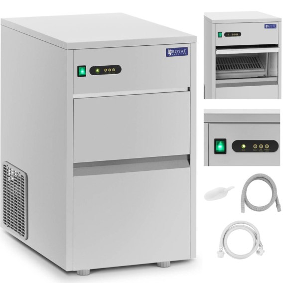 Kostkarka do lodu marki Royal Catering sprawdzi się w barach, restauracjach i wszędzie tam, gdzie niezbędne są schłodzone napoje. Maszyna o dużej mocy 220 W ma wydajność 25 kg / 24 h. W jednym cyklu produkcyjnym wytwarza 16 kostek lodu o wielkości Ø28 x 40 mm. Kostkarka jest szybka, wydajna i cicha przy emisji dźwięku 55 dB, dodatkowo wyróżnia się wysoką pojemnością 7 kg, a przejrzysty panel sterowania jest intuicyjny w obsłudze. Wykonana z eleganckiej stali nierdzewnej jest niewrażliwa na czynniki zewnętrzne i odporna na korozję. Ponad to jest prosta w utrzymaniu czystości dzięki gładkim powierzchniom. Wywietrzniki umieszczone z boku i z przodu urządzenia zapewnia przyjemną atmosferę w kuchni lub za barem, co zapobiega przedostawaniu się ciepłego powietrza bezpośrednio do otoczenia.