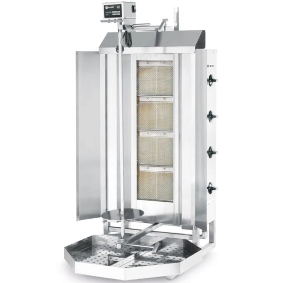Numer producenta: HENDI 226001 Kebab gazowy z serii Profi Line marki Hendi sprawdzi się w każdej profesjonalnej gastronomii. Pracuje na gaz ziemny z możliwością zmiany na gaz butlowy. Urządzenie wyposażone zostało w zawór bezpieczeństwa. Posiada regulację odległości rożna od elementów grzewczych. Wyposażony został także w 2 osłony termiczne ze stali nierdzewnej odchylane skrzydłowo (prawa i lewa) z możliwością ich odkręcenia. Pozwalają one zaoszczędzić do 30% energii. Szeroka powierzchnia grzewcza skraca czas pieczenia. Obudowa urządzenia została wykonana ze stali nierdzewnej AISI-310. Taca na wytopiony tłuszcz jest wyjmowana co ułatwia czyszczenie. Wymagane jest podłączenie do prądu. Cechy produktu: