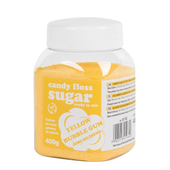 Skład: cukier, aromat gumy balonowej, E102, guma arabska. Candyfloss cotton candy sugar yellow bubble gum. Coloured and flavoured sugar. Ready to use in candy floss maker. Ingredients: sugar, flavouring, E102, arabic gum. Zucker für Zuckerwatte Gelb Bubble-Gum Geschmack. Der farbige und aromatisierte Zucker für produktion Zuckerwatte in alle Zuckerwattemaschinen. Zutaten: Zucker, Aroma, E102, Gummi arabicum.