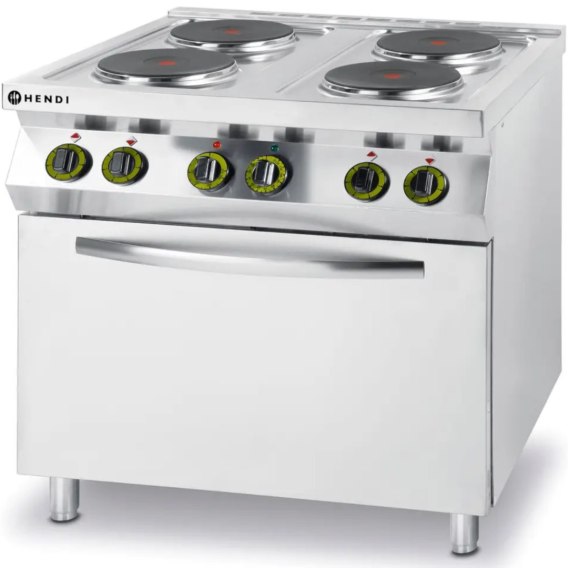 Numer producenta: HENDI 225936 Kuchnia elektryczna marki Hendi została wykonana z wysokiej jakości stali nierdzewnej, co gwarantuje trwałość na długie lata. Kuchnię łatwo utrzymać w czystości. Została wyposażona w 4 płyty grzejne - każda o mocy 2,6 kW, co pozwala na gotowanie w kilku garnkach czy patelniach naraz. Piekarnik GN 1/1 o mocy 3 kW, z zakresem temperatury od 50 do 270deg;C i pojemności 4 x GN 1/1. Regulacja mocy palników i temperatury piekarnika oraz wentylator bez rewersu gwarantują doskonałe efekty przygotowania potraw i umożliwiają dostosowanie urządzenia do indywidualnych potrzeb. Cechy produktu:
