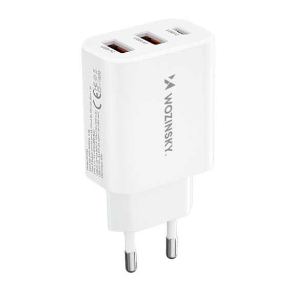 Kod produktu: 1025102 Ładowarka sieciowa Wozinsky CWCUCW to niezastąpione narzędzie, które idealnym wyborem zarówno do użytku domowego, jak i w podróży. Zapewnia szybkie i efektywne ładowanie różnorodnych urządzeń. Dzięki trzem portom wyjściowym - jednemu USB-C i dwóm USB-A - możesz naładować jednocześnie telefon, smartwatch czy słuchawki, co jest nieocenione, gdy czas ma znaczenie. Bezpieczeństwo użytkowania gwarantują wbudowane zabezpieczenia, w tym nadprądowe i przepięciowe. Wytrzymała obudowa z tworzywa PC i ABS chroni ładowarkę przed uszkodzeniami mechanicznymi. Trzy porty wyjściowe