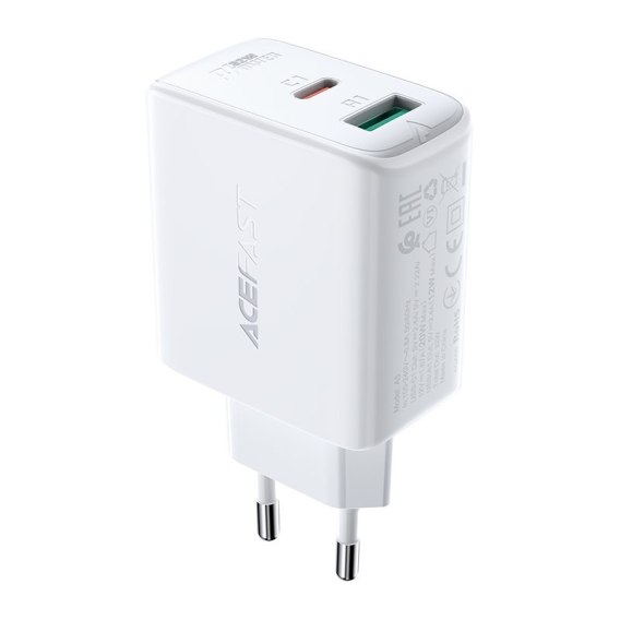 Szybka ładowarka sieciowa marki Acefast. Posiada łącznie 2 porty, USB Typ C i USB. Pierwsza wtyczka USB Typ C oznaczona jako "C1" umożliwia ładowanie z maksymalną mocą 20W, a wtyczka USB A1 do 12W. Pozwala na szybkie ładowanie m.in. w standardach PPS, Power Delivery, Quick Charge 3.0, AFC i FCP. Można do niej podłączyć 2 urządzenia jednocześnie. Jest wykonana z ognioodpornego materiału PC. Została wyposażona w wiele zabezpieczeń takich jak np. przed przegrzaniem, przepięciem, wysokim napięciem czy przeciążeniem.