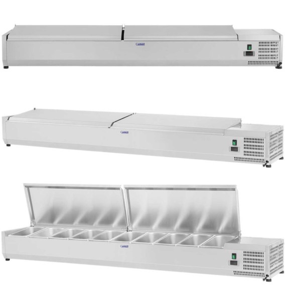 Numer producenta: 10010936 Nadstawa chłodnicza z pokrywą o szerokości 200 cm ułatwi dostęp do niezbędnych składników spożywczych w trakcie przygotowanie potraw. Witryna jest przystosowana do 10 pojemników GN 1/4. Dzięki temu, w urządzeniu można przechowywać różne produkty jednocześnie. Całkowita pojemność nadstawy wynosi 70 l.