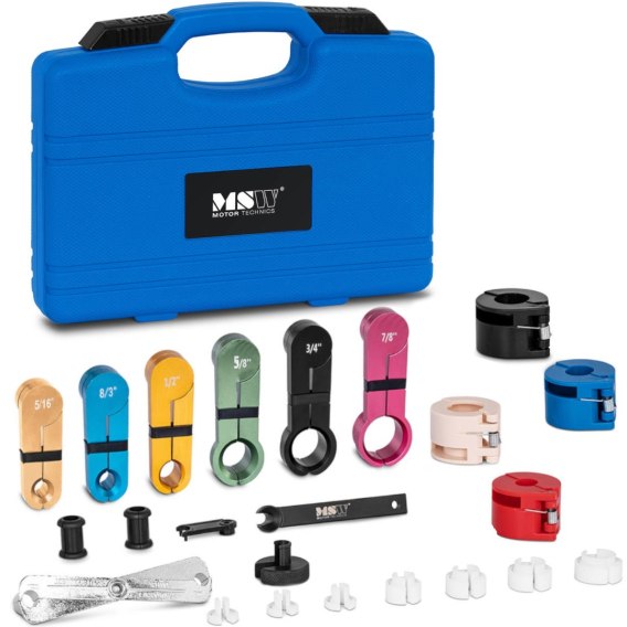Zestaw do złącz paliwowych i klimatyzacji marki MSW zaprojektowano do użytku profesjonalnego w warsztatach i serwisach samochodowych. Zestaw złącz pasuje do szerokiej gamy pojazdów. Dzięki kodowaniu kolorami różnych rozmiarów obsługa przebiega błyskawicznie. Profesjonalny zestaw nadaje się do złącz przewodów paliwowych, klimatyzacji oraz chłodnicy skrzyni biegów. Narzędzie dostarczane jest w praktycznej walizce, która ułatwia transport i przechowywanie.