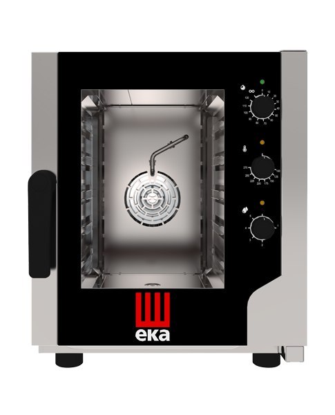 Kod producenta: EKF523NUD Piec konwekcyjno parowy włoskiej marki EKA z serii Evolution New to urządzenie grzewcze zaprojektowane z myślą o wydajnej pracy w profesjonalnej gastronomii, w szczególności w kuchniach otwartych, kawiarniach, barach i stołówkach. Wersja slim (szerokość 55 cm), pozwala zaoszczędzić miejsce w małych pomieszczeniach, np. stacji benzynowej. Komora w całości wykonana została z wysokogatunkowej stali nierdzewnej AISI 304. Piec posiada bezpośredni natrysk, a manualny sterownik umożliwia ustawienie temperatury od 100deg;C do 270deg;C, czas pieczenia oraz stopień zaparowania w zakresie 5-stopniowej regulacji od 0% do 100%. Sterowanie odbywa się za pomocą ergonomicznych pokręteł umiejscowionych na drzwiczkach pieca. Wytwarzanie pary w komorze odbywa się poprzez bezpośredni natrysk wody na wentylator, a kontrola temperatury wewnątrz komory jest dokonywana za pomocą sondy cyfrowej. Urządzenie zostało wyprodukowane zgodnie ze wszelkimi wymogami i standardami HoReCa. Demontowane prowadnice na pojemniki GN zapewniają wygodę i efektywność użytkowania. Cechy produktu: