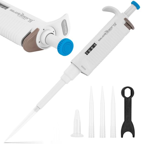 Kod producenta: 10031256 Pipeta jednokanałowa od Steinberg Systems sprawi, że praca w laboratorium będzie szybsza i bardziej ergonomiczna. Za pomocą mikropipety bardzo precyzyjnie odmierzysz i przelejesz ciecze. Dzięki temu model ten idealnie nadaje się do profesjonalnych zastosowań naukowych. Lekka pipeta laboratoryjna jest łatwa do trzymania i nie wymaga dużego wysiłku podczas pipetowania. Dzięki praktycznemu przyciskowi możesz wymienić zużyte końcówki w kilka sekund. W skład dostawy wchodzą końcówki 1000 μl. Naciśnij przycisk, aby zobaczyć indywidualny kod identyfikacyjny modelu. Żądaną ilość dozowanego płynu kontrolujesz, obracając tłok. Na solidnym uchwycie znajdziesz czytelny, 3-cyfrowy wyświetlacz pojemności. Przyrząd zasysa 0,1-1 ml płynu. Pipetę jednokanałową możesz sterylizować w autoklawie. Cechy produktu: