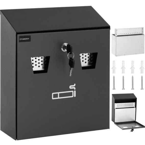 Kod producenta: 10240083 Popielniczka ścienna firmy STAMONY wykonana ze stali walcowanej na zimno nadaje się do użytkowania na zewnątrz. Dzięki proszkowym wykończeniem jest odporna na warunki atmosferyczne i rdzę. Jej duża pojemność zmniejsza częstotliwość opróżniania, a wyjmowany pojemnik zapewnia czystość i wygodę. Całkowity wymiar to 26 x 25 x 9 cm. Łatwa instalacje umożliwia dołączona szczegółowa instrukcja i akcesoria montażowe. Dodatkowo zabezpieczona zamkiem na klucz. Cechy produktu: