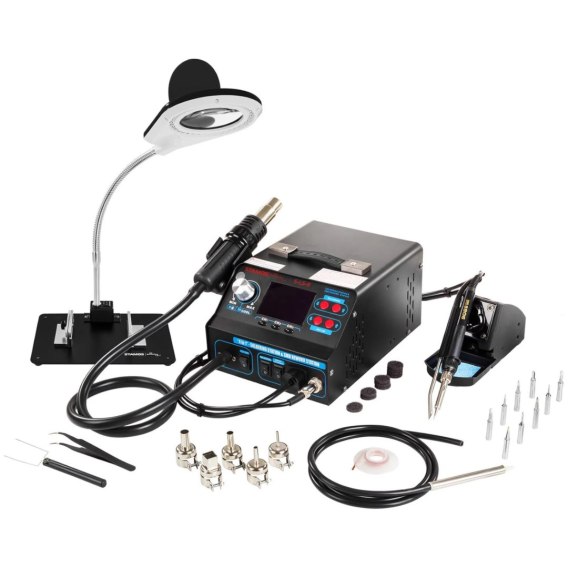 Urządzenie łączy w sobie kilka funkcji niezbędnych przy wykonywaniu profesjonalnych prac lutowniczych z układami elektronicznymi takimi jak SOIC, QFP, PLCC, BGA, SMD itp. Stacja lutownicza została zaprojektowana z myślą o wykonywaniu różnych prac z dzieciny elektroniki, także obróbki tworzyw sztucznych. Wysoka moc stacji wynosi 720 W. Moc kolby lutowniczej wynosi 75W, a kolby na gorące powietrze 550W. Praktyczne pokrętło pozwala na regulację ilości powietrza. Funkcja Cool schładza kolbę i wydłuża czas eksploatacji. Regulacja temperatury w zakresie 100 do 480deg;C następuje za pomocą pokręteł z przodu urządzenia. Duży wyświetlacz LCD z podświetlaniem umożliwia łatwy odczyt parametrów. Urządzenie posiada opcję pamięci i trzy przyciski do zapisu danych. Odsysanie dymów lutowniczych odbywa się za pomocą specjalnej rurki. Funkcję włącza się przyciskiem, a siłę zasysania reguluje pokrętłem. Funkcja Sleep powoduje zmniejszenie temperatury kolby po odłożeniu na podstawkę z gąbką a następnie wyłączenie w ustawionym czasie. Ponowne jej podniesienie włącza urządzenie. Akcesoria znajdujące się w zestawie ułatwiają działanie i obniżają koszty użytkowania stacji lutowniczej. W komplecie stacja z kolbami, lampa ze szkłem powiększającym, 9 grotów lutowniczych, 5 dysz gorącego powietrza, pęsetę, podnośnik do komponentów IC popper oraz taśmę do rozlutowywania. Rączka sprawia, ze stacja jest łatwa w transporcie. Cechy produktu: