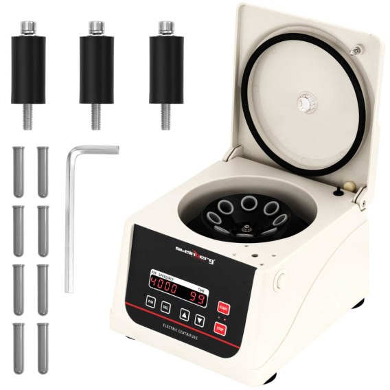 W wirówce można jednorazowo umieścić 8 probówek o pojemności 15 ml każda. Prędkość można regulować w 10 poziomach w zakresie 300-4000 obrotów na minutę, co pozwala dostosować urządzenie do rodzaju badanego płynu. Urządzenie napędza cichy bezszczotkowy silnik DC. Przed uruchomieniem sprzętu należy opuścić pokrywę, o niedomknięciu wieka poinformuje alarm. Timer pozwoli na ustalenie czasu wirowania w przedziale 0-99 min. Cyfrowy panel pozwoli na łatwe określenie wybieranych parametrów. Klawiatura pokryta jest folią, co umożliwia dezynfekcję bez ryzyka uszkodzenia urządzenia. Obudowę wykonano z ABS-u cechującego się odpornością, trwałością, lekkością oraz niewielkimi rozmiarami. Cechy produktu: