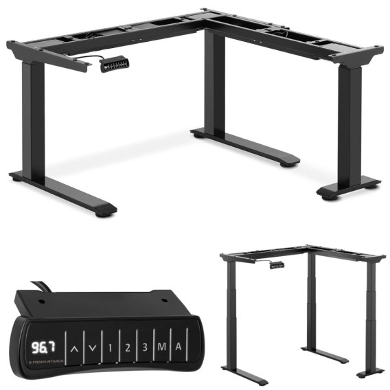 Stelaż biurka narożnego marki Fromm Starck z regulacją wysokości umożliwia zarówno pracę w pozycji siedzącej, jak i stojącej. Stelaż do biurka można regulować na wysokość 600-1250 mm oraz zmieniać szerokość powierzchni roboczych od 900 do 1500 mm (prawa) lub od 1100 do 1900 cm (lewa). Blaty ustawione zostały pod kątem 90deg;. Trzy kolumny podnoszące są regulowane cicho, delikatnie i szybko (38 mm/s) za pomocą 3 silników o mocy 450 W. Sterowanie odbywa się intuicyjnie. Dzięki funkcji pamięci można zapisać do 3 ustawień wysokości i w razie potrzeby szybko je przywołać. Praktyczna rama została wyposażona też w timer, który przypomina o przerwie lub konieczności zmiany pozycji. Konstrukcja wykonana ze stali z elementami wykonanymi z wysokiej jakości tworzywa sztucznego. Gumowe nóżki zapobiegają ślizganiu się i chronią podłogę przed zarysowaniami.