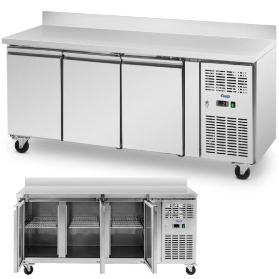 - Gastronomiczny stół chłodniczy o dużej pojemności 410 l i z blatem 179,5 x 70 cm z rantem,
