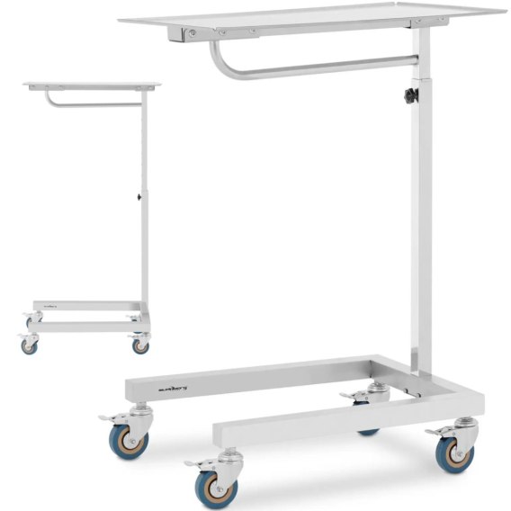 Kod producenta: 10031035 Stolik instrumentalny marki Steinberg Systems pozwala wygodnie położyć narzędzia i przybory, żeby mieć je w zasięgu ręki. Dzięki kółkom mebel można wygodnie przestawić, więc idealnie nadaje się do różnych placówek badawczych. Taca stolika zabiegowego ma wymiary 60 x 40 cm i regulowaną wysokość, którą można ustawić co 5 cm w zakresie 84,5-120 cm zgodnie z własnymi upodobaniami. Dzięki otwartej konstrukcji stolik łatwo można ustawić przy łóżku. Stolik laboratoryjny wyposażono w lekkobieżne kółka o średnicy 75 mm. Pozwala to na szybki i bezproblemowy transport brudnych narzędzi w celu ich wyczyszczenia. Kółka można zablokować, co zapewnia bezpieczny postój. Cechy produktu: