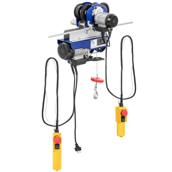 Wciągarka elektryczna marki MSW została stworzona na potrzeby handlu i szczególnie nada się do stosowania w dużych magazynach lub pomieszczeniach zamkniętych. Wciągnik linowy wyposażono w mocną stalową liną o długości 12 m, która udźwignie do 150 kg. Przy użyciu zblocza, siła uciągu podwoi się do 300 kg. Oznacza to, że bez żadnych problemów można będzie przetransportować różne ciężkie przedmioty z jednego miejsca do drugiego. Po zastosowaniu zblocza wysokość podnoszenia zmniejszy się o połowę do 6 m, a prędkość podnoszenia z 8 do 4 m/min. Ładunek przez cały czas będzie przymocowany do liny o grubości 3 mm za sprawą haka. Solidna linka ze stali Ck45 nie ulegnie skręcaniu, a także zniesie wieloletnie i intensywne użytkowanie. Zabezpieczenie przed przeciążeniem sprawi, że wciągarka będzie pracować niezawodnie i wydajnie przez długi czas, a silnik o mocy 550 W nie ulegnie przegrzaniu. Dołączona suwnica umożliwi także transport po zakrzywionej szynie, o ile promień łuku wyniesie minimum 1 m. Elektromagnetyczny układ hamulcowy zapewnia cichą pracę i utrzyma ładunek bez najmniejszego problemu. Wciągarkę można obsłużyć za pomocą dwóch intuicyjnych pilotów z kablami o długości 1,45 m. Zastosowano również redukcję naprężenia, z którą można bezpiecznie pracować przez cały czas. Chroni ona przewody pilotów, wydłużając i tak już długą żywotność urządzenia. Wciągarkę PROCAT 300 można przymocować do stalowej belki o szerokości 68 - 94 mm i wysokości co najmniej 110 mm. Mogą to być belki szerokostopowe, teowniki lub dwuteowniki. Cechy i funkcje: