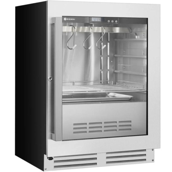 Kod producenta: 221426 Szafa do sezonowania mięsa firmy HENDI oferuje kontrolowane środowisko do dojrzewania mięsa, dzięki któremu można uzyskać niezwykle kruche i smaczne mięso. Szafa została zaprojektowana tak, by doskonale odwzorować mikroklimat wykorzystywany do tradycyjnego, naturalnego dojrzewania mięsa. Równocześnie, innowacyjna technologia umożliwia stałą kontrolę nad procesem sezonowania poprzez utrzymywanie stabilnej wentylacji, regulowanej wilgotności powietrza oraz sterylizacji. Przeszklenie drzwi zostały wykonane z 2 warstw hartowanego szkła powlekanego niskoemisyjnego, co zwiększa wydajność energetyczną szafy poprzez blokowanie promieniowania UV oraz przedostawania się ciepła z zewnątrz. Pojemnik na wodę destylowaną wykonany jest z tworzywa ABS - wodę destylowaną należy uzupełnić ręcznie. Urządzenie posiada dwa alarmy: alarm dźwiękowy, który sygnalizuje niską wilgotność poniżej 15% i konieczność uzupełnienia wody oraz alarm sygnalizujący drzwi pozostające otwarte przez więcej niż 3,5 minuty. Jest to zabezpieczenie przed niekontrolowanym zaburzeniem warunków panujących w komorze. Wbudowana lampa UVC do sterylizacji zapobiega rozwojowi bakterii i gwarantuje bezpieczne środowiska dla mięsa. Po otwarciu drzwi szafy w trakcie procesu sezonowania bakterie nie będą miały szansy się rozwinąć. Chłodzenie wymuszone wentylatorem zapewnia odpowiedni poziom cyrkulacji powietrza. Obudowa, rama drzwi i uchwyt drzwi oraz akcesoria zostały wykonane ze stali nierdzewnej AISI 304. Cechy produktu: