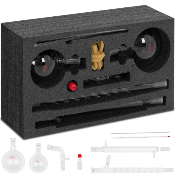 - 14-częściowy zestaw szkła laboratoryjnego z akcesoriami do destylacji, oczyszczania lub syntezy,