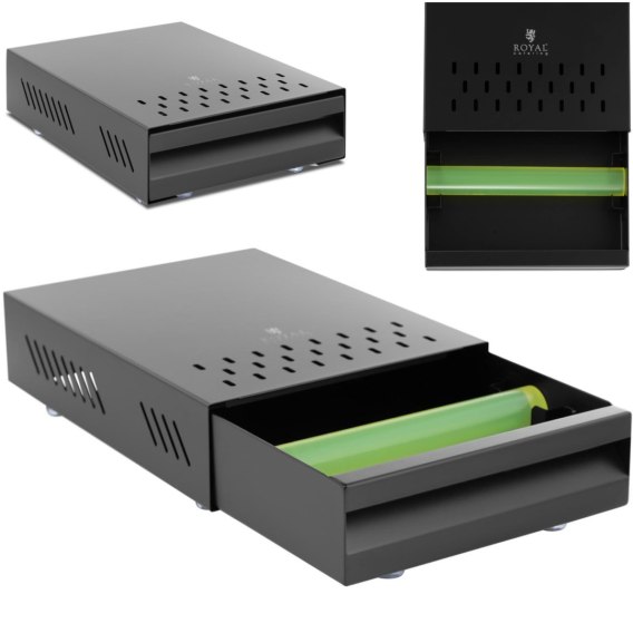 Kod producenta: 10012606 Szuflada z odbijakiem marki Royal Catering jest niezbędnym wyposażeniem barów, kawiarni, restauracji i innych lokali gastronomicznych gdzie serwuje się klientom świeżą kawę. Pojemnik pozwala na szybkie i całkowite opróżnienie kolby po przygotowaniu kawy. Duża szuflada ma wymiary 245 x 345 x 90 mm. Duża pojemność 5,7 l sprawia, że rzadko wymaga opróżnienia. Szufladę z odbijakiem wygodnie można ustawić pod młynkiem lub ekspresem do kawy. Pojemnik wykonany został z wysokiej jakości stali nierdzewnej, odpornej na korozję i łatwej w czyszczeniu. Cechy produktu: