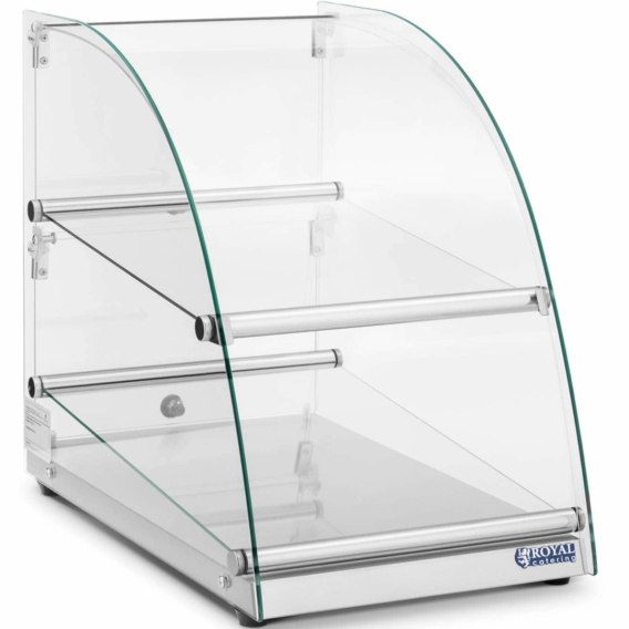 Kod producenta: 10012870 Witryna marki Royal Catering sprawdzi się do prezentowania ciast czy deserów na ladach w piekarniach, cukierniach, bistrach czy kawiarniach. Pojemność gabloty wynosi 70 l. Dwa poziomy mają wymiary 33,5 x 41,8 cm oraz 33,5 x 49,5 cm. Obciążenie każdej półki wynosi do 10 kg. Duże drzwi z przodu umożliwiają łatwe napełnianie i wyjmowanie produktów. Witrynę wykonano ze szkła hartowanego, pleksiglasu, stali nierdzewnej, dzięki czemu doskonale się prezentuje, posiada długą żywotność i jest łatwa w czyszczeniu. Antypoślizgowe nóżki zapewniają jej stabilność i chronią powierzchnię blatu przed zarysowaniem. Cechy produktu:
