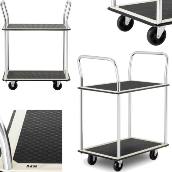 Wózek półkowy marki MSW sprawdzi się w hotelach, sklepach, magazynach, hurtowniach do przewożenia ciężkich przedmiotów o różnej wielkości. Konstrukcja wózka wykonana została ze stali, jej nośność wynosi 120 kg. Dwie półki z antypoślizgowymi matami o wymiarach 72 x 43 cm będą odpowiednie także do dłuższych ładunków. Po obu stronach wózka znajdują się ręczne uchwyty wykonane ze stali. Cztery gumowe kółka o średnicy 10 cm (w tym dwa skrętne) umożliwiają bezproblemowe manewrowanie wózkiem. Wózek jest łatwy w konserwacji i czyszczeniu.