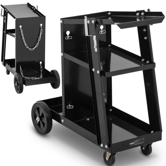 Wózek spawalniczy sprawdzi się do przechowywania sprzętów i narzędzi w branży spawalniczej oraz do ich wygodnego transportu. Wózek posiada 3 półki, jego maksymalna nośność wynosi 80 kg. Posiada także specjalną półkę na butlę z gazem oraz dwa metalowe łańcuchy do utrzymania jej w odpowiedniej pozycji. Po obu stronach umieszczone są uchwyty na przewody. 4 kółka zapewniają wózkowi mobilność. Para tylnych kółek o średnicy 190 mm jest wsparciem dla konstrukcji wózka, kółka przednie są mniejsze i skrętne (360 stopni). Konstrukcja sprzętu wykonana została z odpornej, pomalowanej na czarno stali.