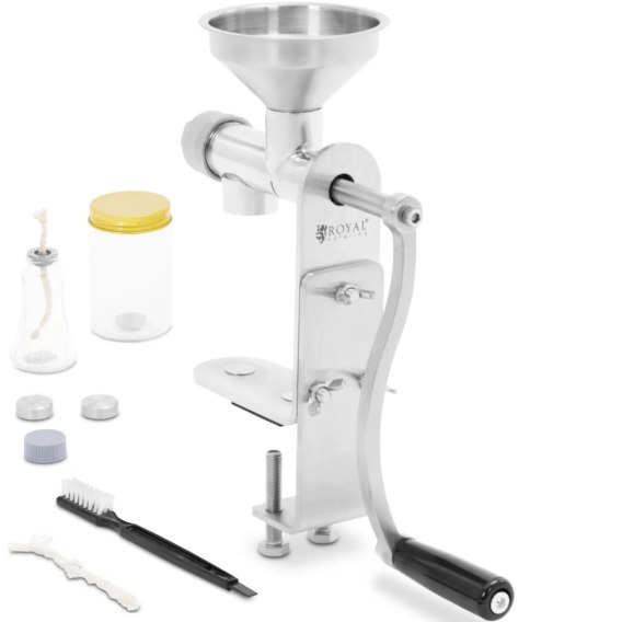 Kod producenta: 10013189 Ręczna prasa do tłoczenia oleju marki Royal Catering pozwala w krótkim czasie wyprodukować świeże oleje. Wyciskarka to świetna propozycja dla osób dbających o odżywianie, które lubią mieć pełną kontrolę nad przygotowaniem potraw. Od orzechów po nasiona, ta maszynka do tłoczenia oleju oferuje szeroki zakres zastosowań i jest szczególnie odpowiednia do różnych ziaren, nasion i owoców o zawartości tłuszczu co najmniej 25%. Aby rozgrzać ręczną prasę do oleju (około 7 minut) i utrzymać ją w cieple podczas pracy (około 50 - 70deg;C), należy użyć dostarczonej butelki i napełnić ją w 80% płynnym paliwem, użyć knota o długości 15 cm. Włożyć go przez otwór w pokrywie tak, aby wystawało około 5 mm, a reszta pozostała w butelce. Gdy maszynka do tłoczenia oleju osiągnie wymaganą temperaturę, stopniowo należy umieszczać ziarna lub nasiona do lejka o średnicy 105 mm i za pomocą ergonomicznej korby wyciskać olej, który będzie zbierany do dołączonej butelki. Mocowanie do stołu zapewnia stabilność podczas pracy oraz oszczędza miejsce w kuchni. Ręczna prasa do oleju spełnia też standardy gastronomiczne, odznacza się wysoką jakością wykonania, jest higieniczna i solidna. Zastosowany materiał pozwala także na łatwe i dokładne mycie. Zdejmowane części ułatwiają utrzymanie prasy do tłoczenia oleju w czystości i przygotowanie jej do kolejnego użycia. Cechy produktu: