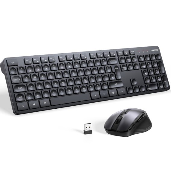 Kod produktu: 1023115 Zestaw bezprzewodowej klawiatury i myszy marki Ugreen zaspokoi Twoje potrzeby zarówno podczas pracy, zabawy jak i w czasie gier wideo. Stabilne i bezprzewodowe połączenie 2,4 GHz zapewni Ci swobodę ruchów i pozwoli uniknąć zakłóceń sygnału. Pełnowymiarowa klawiatura ułatwi Ci korzystanie z komputera, umożliwiając obsługę głośności, odtwarzania multimediów i przełączanie utworów. To doskonałe rozwiązanie dla osób, które potrzebują szybkiego dostępu do różnych funkcji. Klawiatura posiada optymalnie ustawiony kąt nachylenia, co zapewnia ergonomiczną pozycję dla dłoni i nadgarstków podczas pisania. Lekka i precyzyjna myszka, wyposażona w czujnik 4000 DPI zapewnia pełną swobodę ruchów i dokładną kontrolę. Myszka jest zasilana jedną baterią AAA. Ten zestaw to praktyczne rozwiązanie dzięki wtyczce USB typu Plug-and-play, która łączy zarówno klawiaturę, jak i myszkę. Nie musisz instalować żadnych sterowników, co oznacza, że możesz zacząć korzystać z zestawu od razu po podłączeniu. Najważniejsze cechy: