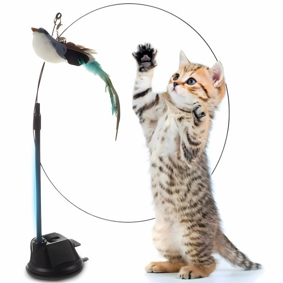 - Stymulacja instynktu łowcy poprzez realistyczny ptaszek z piórami i dzwoneczkiem,