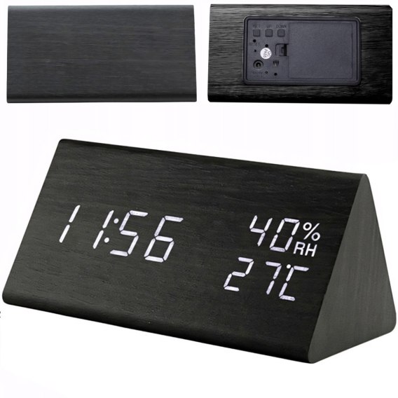Zegar z funkcją budzika, termometru i higrometru w formie graniastosłupa trójkątnego w oprawie imitującej drewno. Elegancki design sprawia, że doskonale komponuje się w każdym wnętrzu, a jego funkcjonalność poprawi każdy poranek. Dzięki systemowi sterowania głosem wyświetlacz aktywuje się po klaśnięciu lub dotknięciu, co oszczędza energię. Posiada trzy niezależne alarmy oraz dwa tryby wyświetlania - DP1- stałe wyświetlanie wilgotności, temperatury, czasu i daty, DP-2 wilgotność, temperatura, czas i data są wyświetlane na zmianę.
