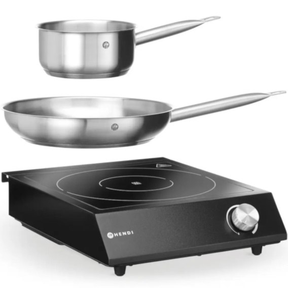 Zestaw do gotowania marki Hendi sprawdzi się na wszelkiego rodzaju wyjazdach czy gotowaniu w plenerze. W skład zestawu wchodzi kuchenka indukcyjna 3500W, rondel, patelnia. Kuchenka oferuje doskonałe podgrzewanie, które jest zamknięte w kompaktowym i gustownym designie - powierzchnia wykonana ze szkła wraz z obudową ze stali malowanej proszkowo zapewniają zarówno wytrzymałość, jak i elegancję. Moc regulowana jest za pomocą pokrętła. Urządzenie posiada 31 poziomów mocy, od 500 W do 3500 W. Maksymalne dopuszczalne obciążenie wynosi 20 kg. Kuchenka przystosowana została do naczyń z dnem o średnicy 120 - 260 mm, posiada zabezpieczenie przed przegrzaniem. Patelnia o średnicy 28 cm posiada uchwyt o długości 22 cm. Rondel o średnicy 16 cm i pojemności 1,5 l wyposażono w uchwyt o długości 17 cm. Oba te naczynia wykonano ze stali nierdzewnej, posiadają dno typu "sandwich" wykonane z 3 warstw: stali nierdzewnej, aluminium, stali nierdzewnej.