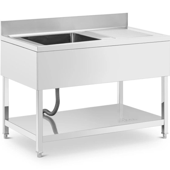 - Stół ze zlewem z ociekaczem i dolną półką zapewnia więcej miejsca do przechowywania,